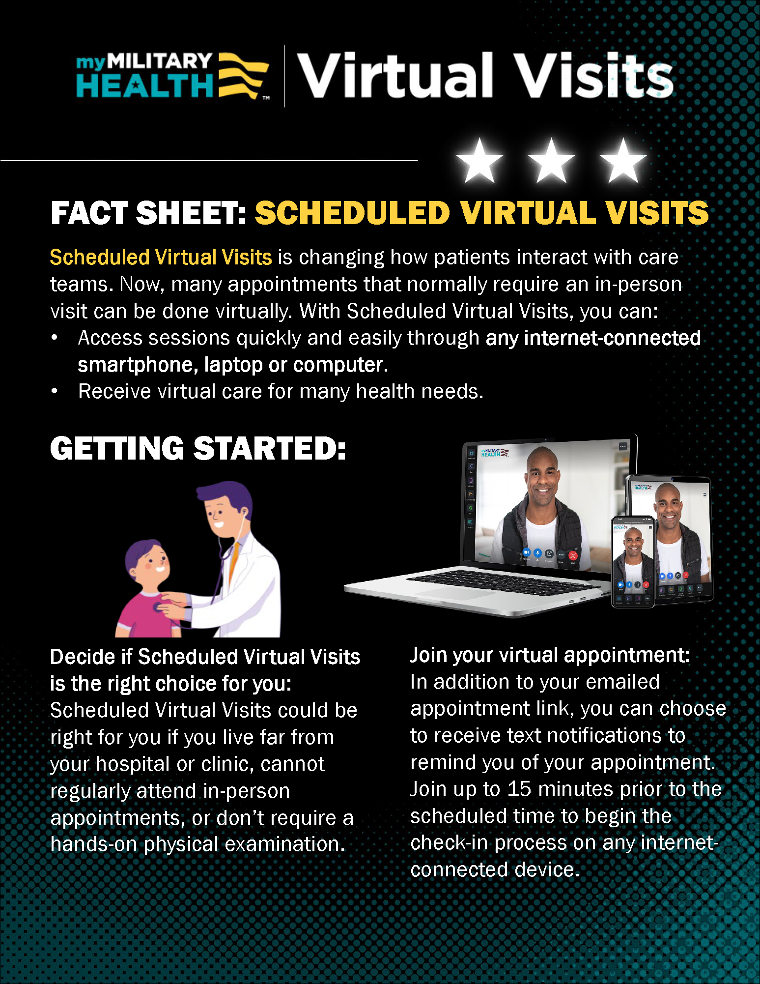Joining a video visit is easy by using a smartphone, tablet, or computer with a camera, speaker, and a strong internet connection. The patient will receive a reminder email 24 hours and 30 minutes prior to the scheduled appointment time and a reminder email and text message when it's time to join the appointment. They can also enter directly from the MHS GENESIS Patient Portal up to 30 minutes before the appointment time, which means no extra logins or apps for patients to download. And since Scheduled Virtual Visits are integrated with MHS GENESIS, providers can easily access patient charts, provide referrals, enroll patients in other care programs, and schedule follow-up appointments.